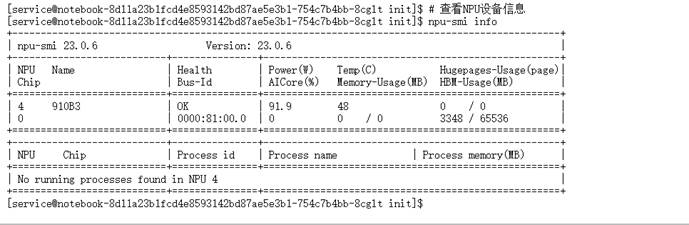 这个命令会显示异腾910B NPU的详细信息,包括设备数量、内存大小等。在我们的环境中,应该能看到1个NPU设备,拥有64GB内存,这为我们运行大模型提供了充足的算力保障。