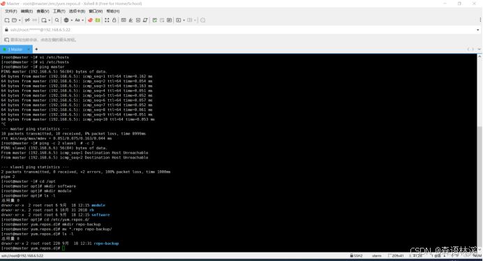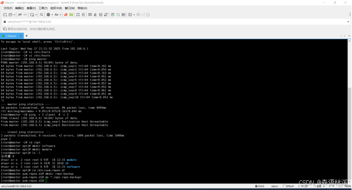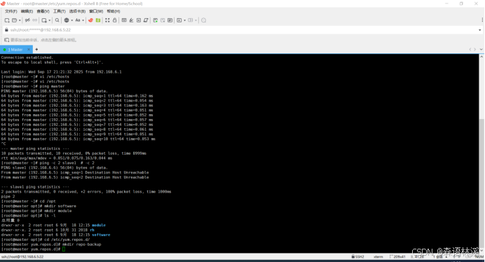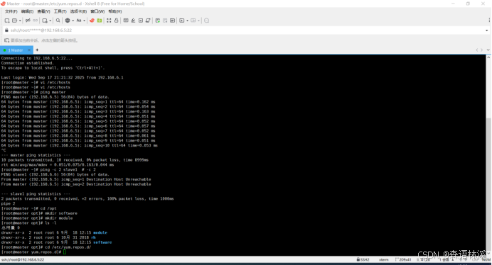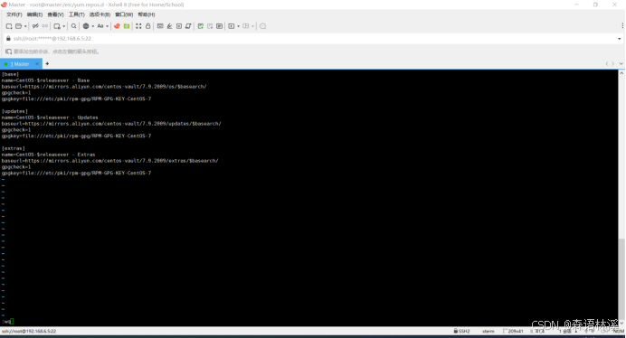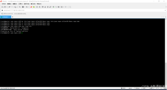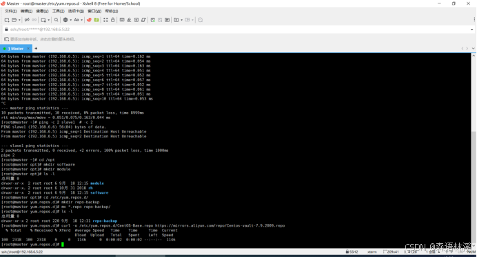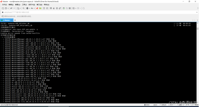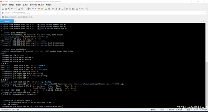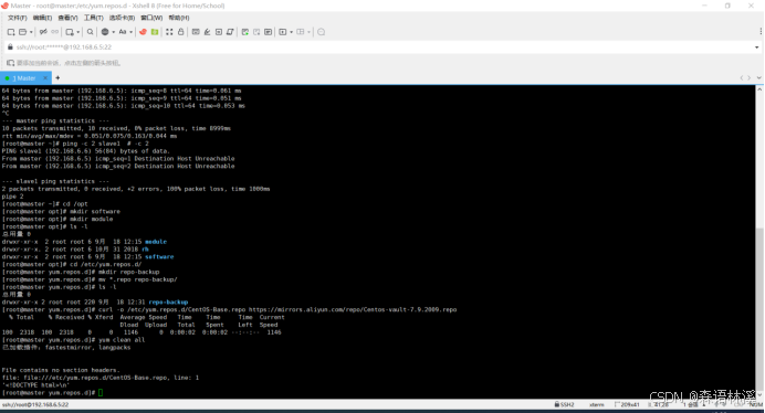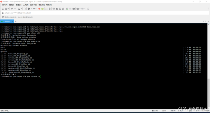 root@master yum.repos.d\]# yum clean all 已加载插件:fastestmirror, langpacks 正在清理软件源: base extras updates Cleaning up list of fastest mirrors 说明清理缓存成功。  **2.建立新缓存**: ```bash yum makecache ```  #### 2.5 执行系统更新 使用新源进行系统更新: ```bash yum update -y ```  更新过程可能需要较长时间,具体取决于网络速度:   ### 三、配置说明和注意事项 #### 3.1 配置文件详解 | 配置段 | 作用 | 镜像地址 | |-------------|-------|-----------------| | `[base]` | 基础软件包 | 7.9.2009操作系统基础包 | | `[updates]` | 更新软件包 | 7.9.2009系统更新包 | | `[extras]` | 额外软件包 | 7.9.2009额外软件包 | #### 3.2 重要注意事项 1. **更新后重启** :`yum update -y`会更新系统内核,建议重启以确保所有更新生效 2. **版本锁定**:配置中固定使用7.9.2009版本,确保软件包版本一致性 3. **网络要求**:需要稳定的网络连接来完成软件包下载 ### 四、验证源配置是否成功 更新完成后,可以通过以下命令验证: # 检查可用的软件包列表 ```bash yum list available | head -10 ``` # 测试安装软件 ```bash yum install -y wget ``` # 查看已配置的源 ```bash yum repolist all ``` ### 五、故障排除 #### 5.1 常见问题及解决方案 **问题1:curl命令不存在** **# 安装curl** ```bash yum install -y curl ``` **问题2:GPG密钥验证失败** **# 导入GPG密钥** ```bash rpm --import https://mirrors.aliyun.com/centos/RPM-GPG-KEY-CentOS-7 ``` **问题3:网络连接超时** * 检查网络连接 * 尝试使用其他镜像源(如清华源、163源) ### 六、其他镜像源选择 如果阿里云源出现问题,可以考虑其他镜像源: #### 清华大学镜像源: ```bash https://mirrors.tuna.tsinghua.edu.cn/centos-vault/7.9.2009/ ``` #### 网易镜像源: ```bash http://mirrors.163.com/centos-vault/7.9.2009/ ``` ### 技术总结 通过本教程,我们成功完成了: 1. **原有源配置文件的完整备份** 2. **阿里云镜像源的手动配置** 3. **yum缓存的清理和重建** 4. **系统全面更新** 现在系统已经配置了可用的软件源,为后续大数据组件的安装奠定了坚实基础。 *** ** * ** *** **下篇预告**:下一篇我们将开始安装 EPEL 源 *** ** * ** *** **觉得这篇文章对你有帮助吗?** 👍 **点赞** + ⭐ **收藏** + 👁 **关注**,一键三连,鼓励我继续创作更多优质教程! **系列文章目录:** * 第十三篇:[大数据环境搭建从零开始(十三):创建文件夹](https://blog.csdn.net/2501_93530370/article/details/154352188?fromshare=blogdetail&sharetype=blogdetail&sharerId=154352188&sharerefer=PC&sharesource=2501_93530370&sharefrom=from_link "大数据环境搭建从零开始(十三):创建文件夹") * **第十四篇:CentOS 7系统更新源更换详解(本文)** * 第十五篇:敬请期待... **有任何源配置问题,欢迎在评论区留言讨论!**