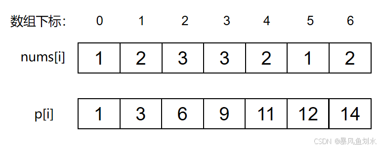 示例:假设我们要统计nums[i]这个数组上的区间和。我们先做累加,即p[i]表示下标0到i的nums[i]累加之和。