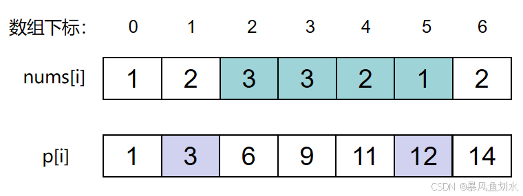 如果,我们想统计nums数组上下标2到下标5之间的累加和,是不是用p[5]-p[1]即可: