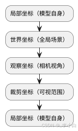 在3D渲染流水线中,一个顶点从被定义到最终显示在屏幕上,需要经历5个坐标系 的转换。而模型、视图、投影矩阵正是这一转换链路的核心驱动者: