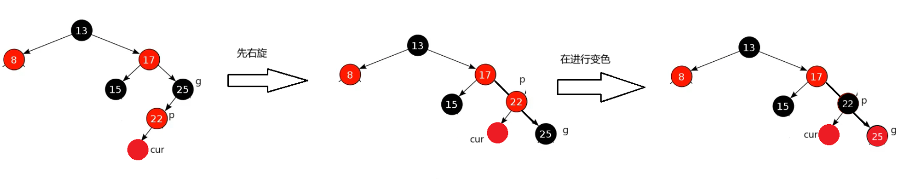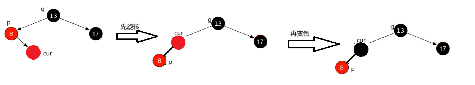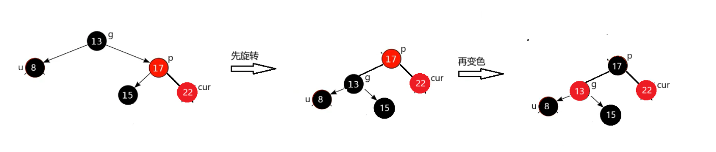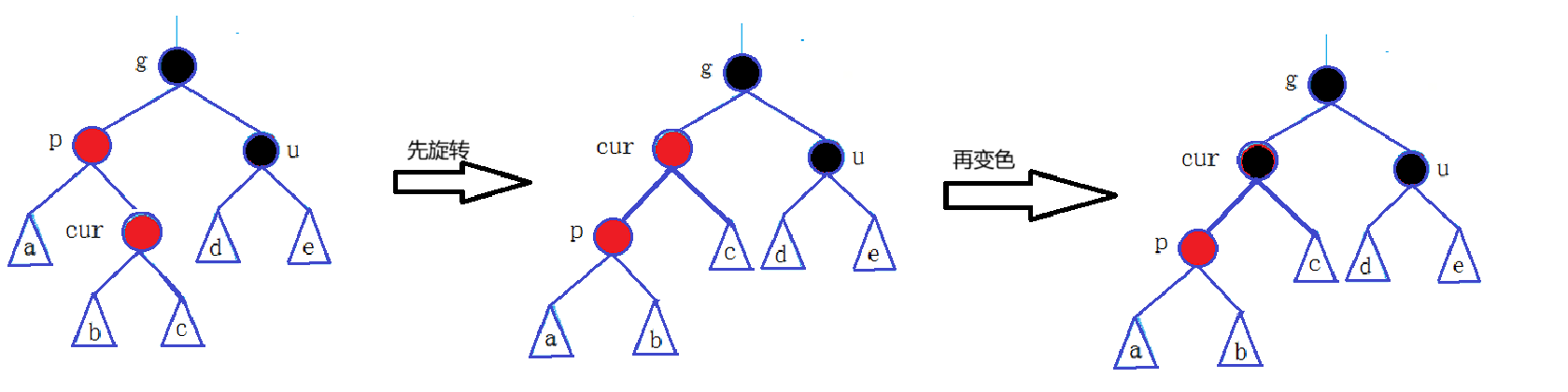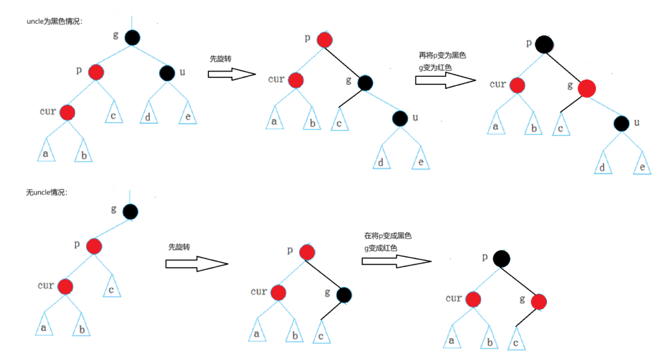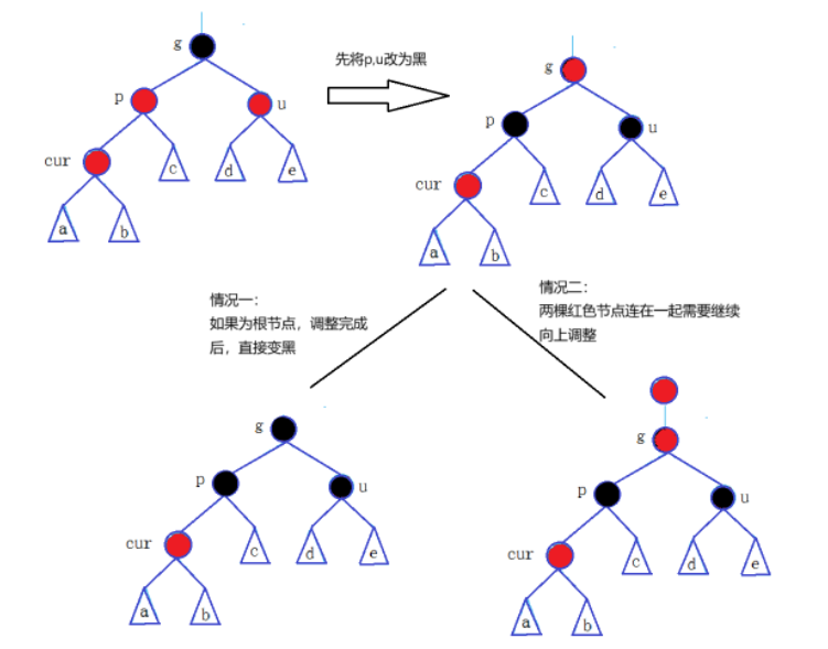 面对二的情况需根据具体情况进行调整,具体如下:(先约定:cur为当前节点,p为父节点,g为祖父节点,u为叔叔节点)