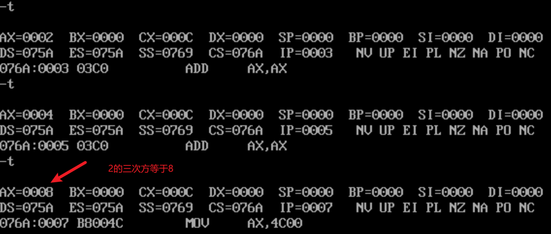 去掉注释后的源码经过编译、连接后,使用debug的-t 来调试,最终ax=0008,是正确的,如下图所示