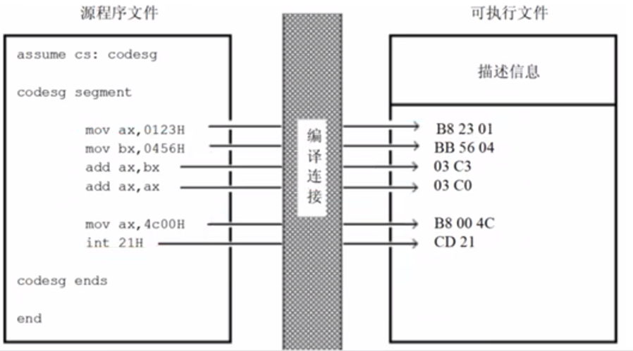 汇编指令是为了让计算机完成任务,汇编指令经过编译连接(link)之后会转换成对应的机器码。如下图所示: