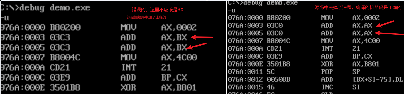 下面使用debug的-u 来查看反编译的结果,源码加了注释编译后机器码不正确,变成了ADD AX,BX(左图),可能是注释有中文(老版本的汇编器如MASM、TASM对中文支持不好)。