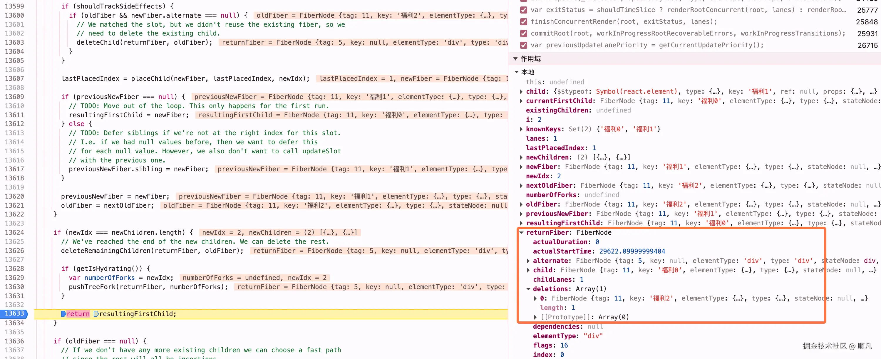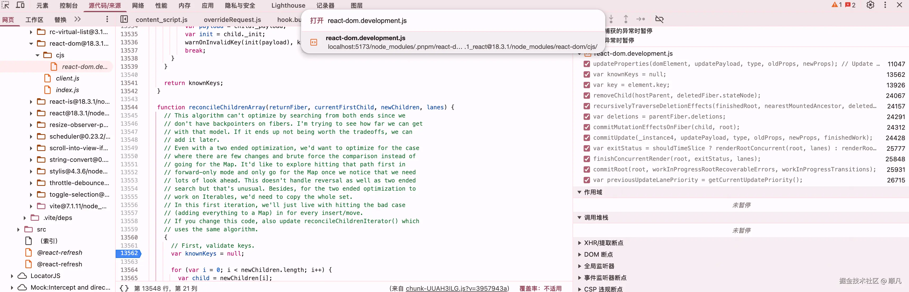 开始 debug,打开控制台 command + shif + p,搜索并进入 react-dom.development.js 文件,搜索 reconcileChildrenArray 方法,打上断点