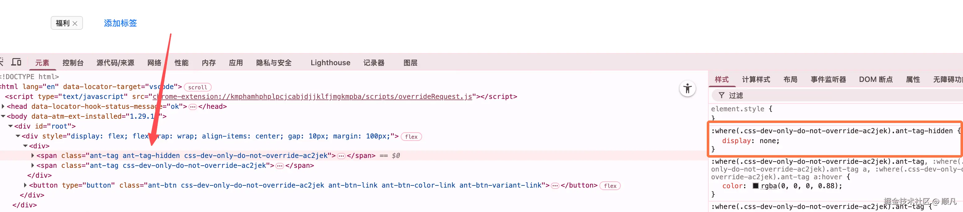 React Diff 的处理也没问题呀,被标记删除的是最后一个节点,第一个节点也被正确复用了,什么情况?难道后面的代码出了问题,我就讲断点就放到了 commitRoot 方法,先看了 root.finishedWork 发现也是正确的,后面继续执行了几下,想找出问题出在哪...就突然觉的这个福利节点是不是真没被删除,但是被隐藏掉了,我就切换到了元素控制台,还真是我去!!!这为啥多了个 ant-tag-hidden 的类