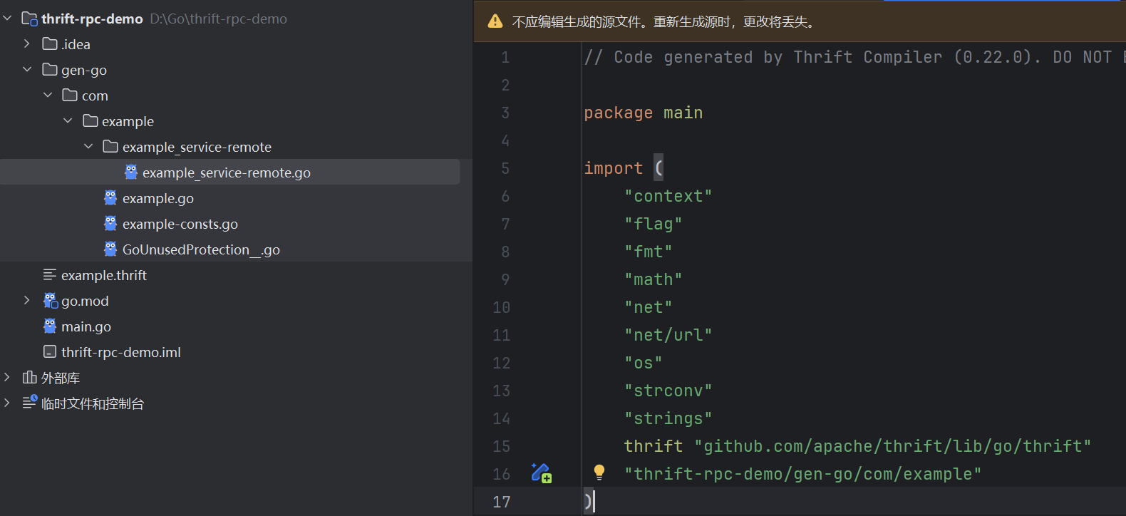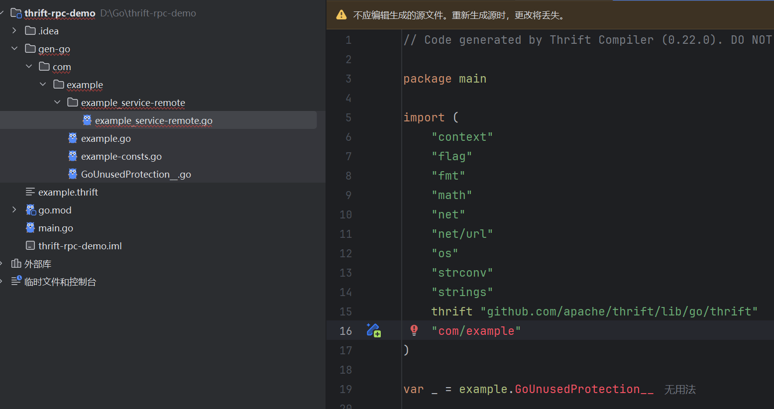 这里发现一个问题:可以看到example_service-remote.go这个文件当中的import存在问题
