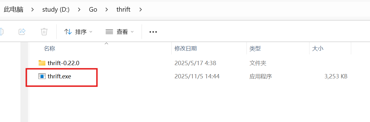 4.下载好的exe文件,存放到自己设置的文件夹,然后改名为thrift.exe(原本下载好的文件会带版本号,需要改名)