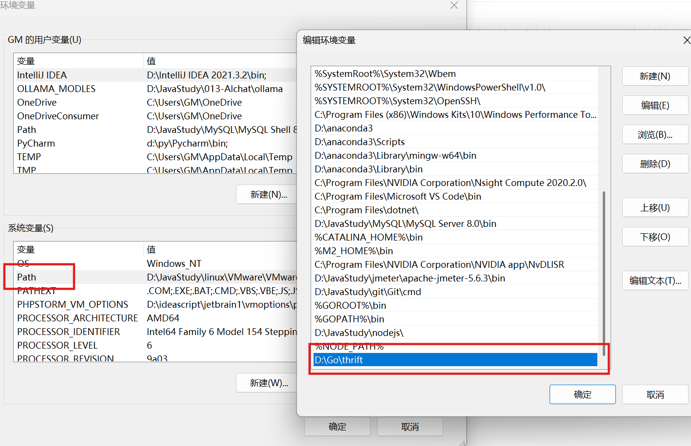 系统变量的Path变量当中,新增一条:thrift.exe的路径(D:\Go\thrift)