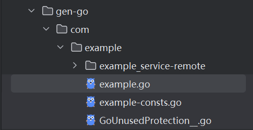 thrift --gen go example.thrift // 默认创建一个gen-go的目录,下面有example子目录,里面包含了生成的代码