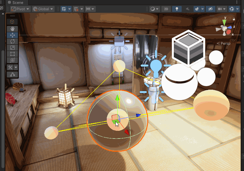 放置任意sphere物体到烘焙完成的点之间移动,如果线跟随物体进行移动则说明正在计算动态物体表面光照。