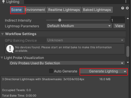 执行烘焙 :在光照面板启动烘焙,生成 Light Probe 数据。