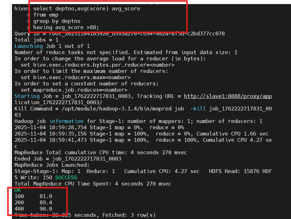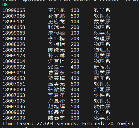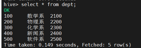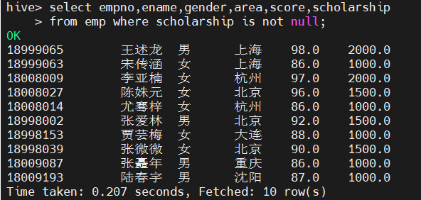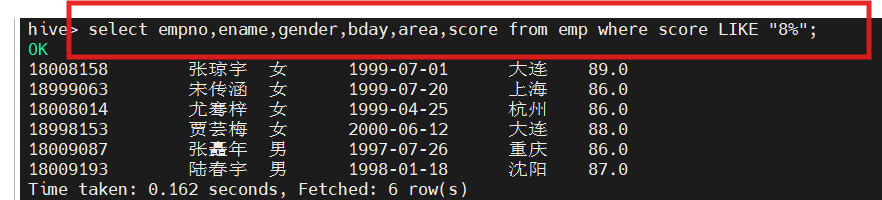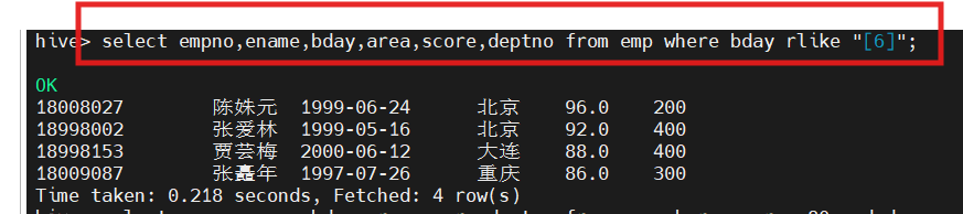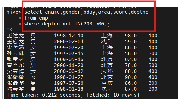 hive(hivedwh)>select empno,ename,bday,area,score,deptno from emp where deptno not IN(200, 500);