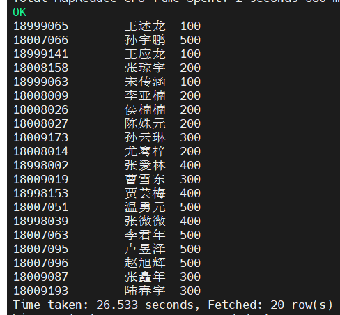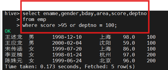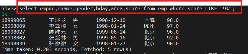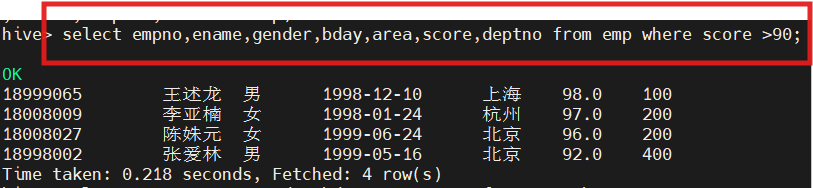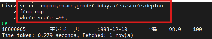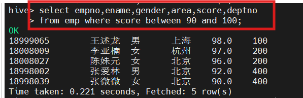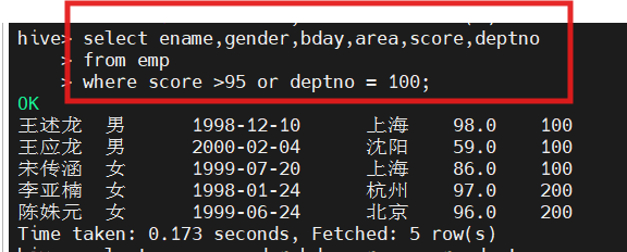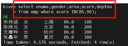 hive(hivedwh)>select ename,gender,area,score,deptno from emp where score IN (86, 96);