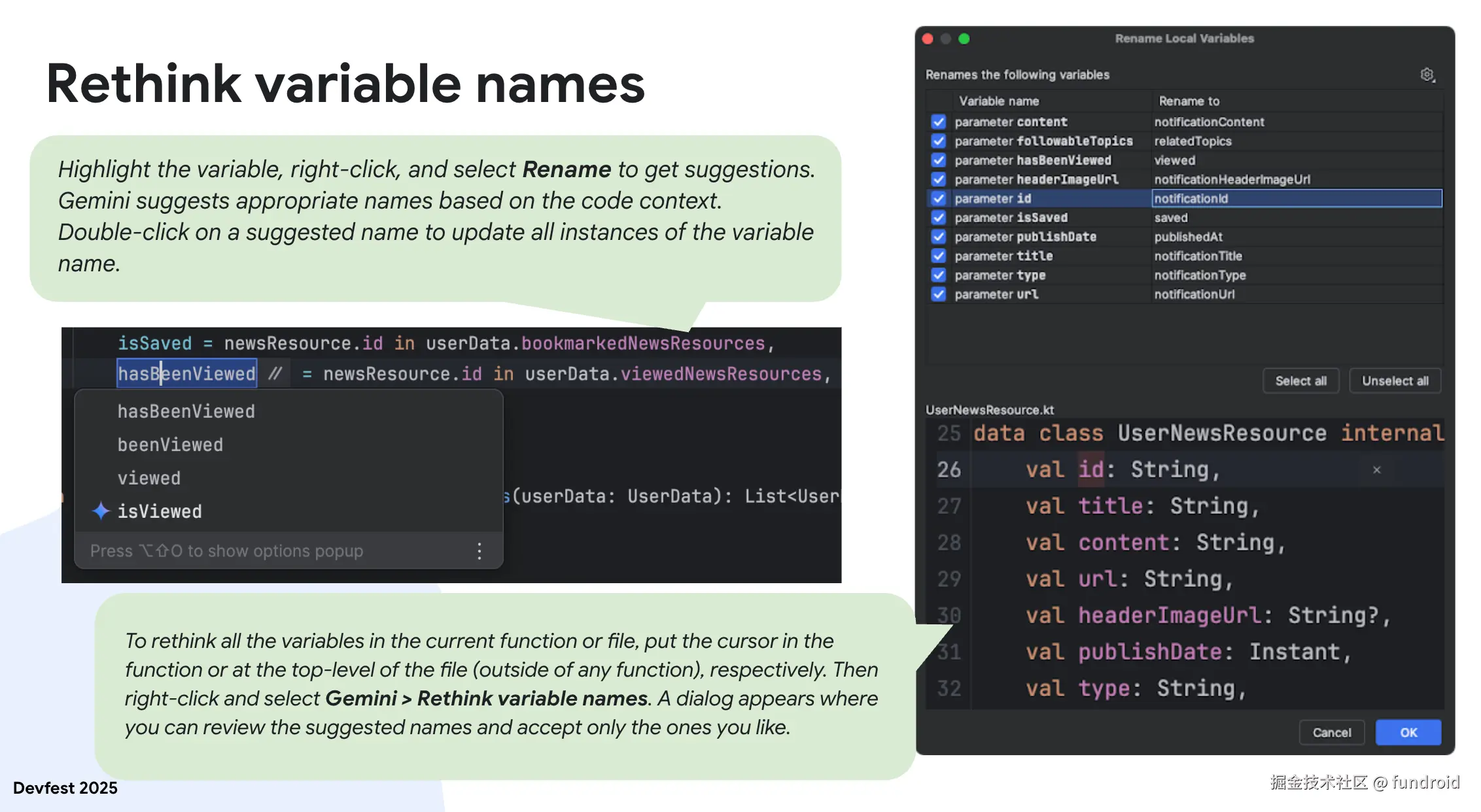 Code with Gemini 将 AI 能力深度融入编码核心环节,解决了开发者最头疼的一系列问题。代码补全功能不再局限于语法层面的简单提示,而是基于上下文逻辑的智能推演,能预判开发者的编码意图并提供完整代码片段;代码转换功能支持对存量代码进行定向优化,无论是简化冗余代码、提取公共方法,还是统一变量命名规范,都能一键完成,从根源上提升代码质量。