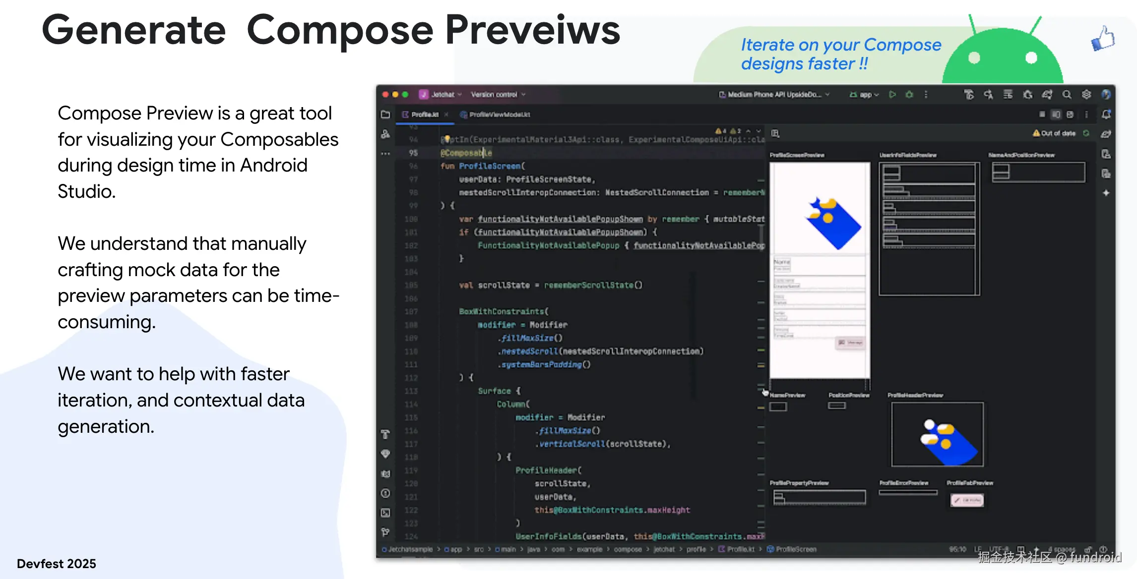 对于 Compose 开发而言,Preview 代码的编写往往耗时耗力 ------ 为了让 Preview 正常运行,开发者需要手动 Mock 上下文、配置参数,久而久之便会放弃编写 Preview,影响 UI 开发效率。而 Gemini 可对指定的 Composable 组件一键生成 Preview 代码,自动处理上下文依赖和参数配置,让开发者无需手动操作就能实现 UI 实时预览。