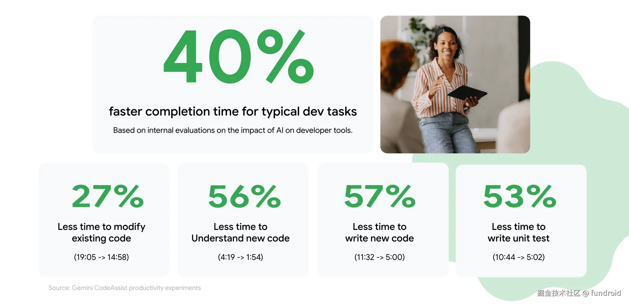 谷歌内部数据早已验证了这种协同的强大威力:通过将 AI 深度集成到开发流程,传统开发任务完成时间提效 40%,增量代码迭代效率提升近 60%,新人理解存量代码的速度提升 56%,单测编写时间压缩 53%。目前为止,谷歌 50% 的代码来自 AI 智能补全,其中 23% 来自 Android Studio。如今谷歌将这一成熟的 AI 开发方案开放给整个安卓生态,旨在通过 Android Studio + Gemini 的组合,解决移动端 AI Coding 普及滞后的痛点,让每一位安卓开发者都能享受到 AI 带来的效率革命。