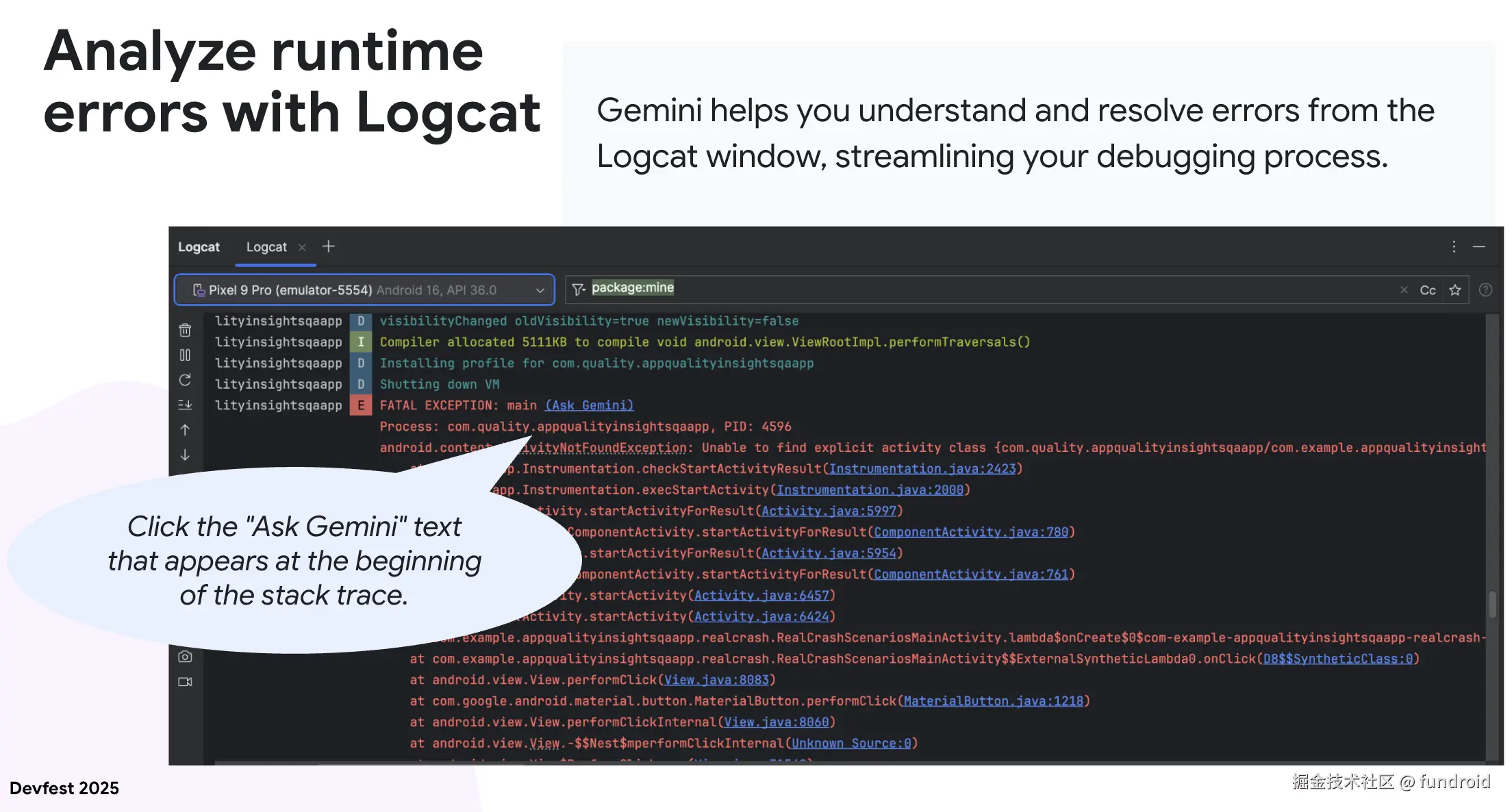 开发效率提升的同时,代码质量也不能掉队。Android Studio + Gemini 在质量保障环节同样表现出色:Logcat 窗口中出现错误时,点击 "Ask Gemini" 按钮,AI 会自动分析错误堆栈并提供解决方案;与 APP Quality Insights 集成后,还能同步线上 Crash 数据,帮助开发者快速定位并修复线上问题。