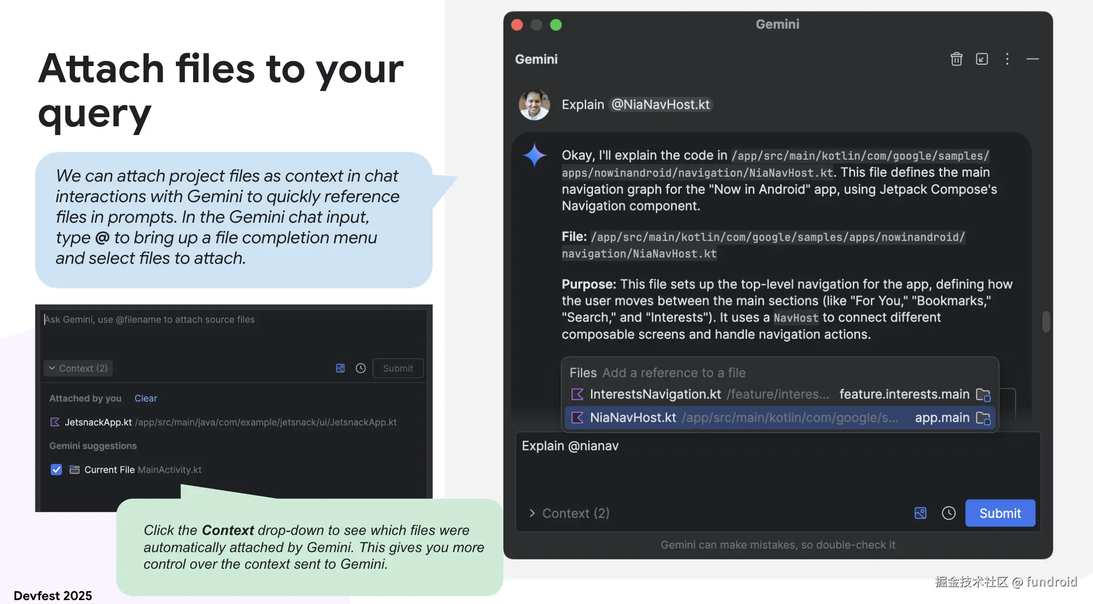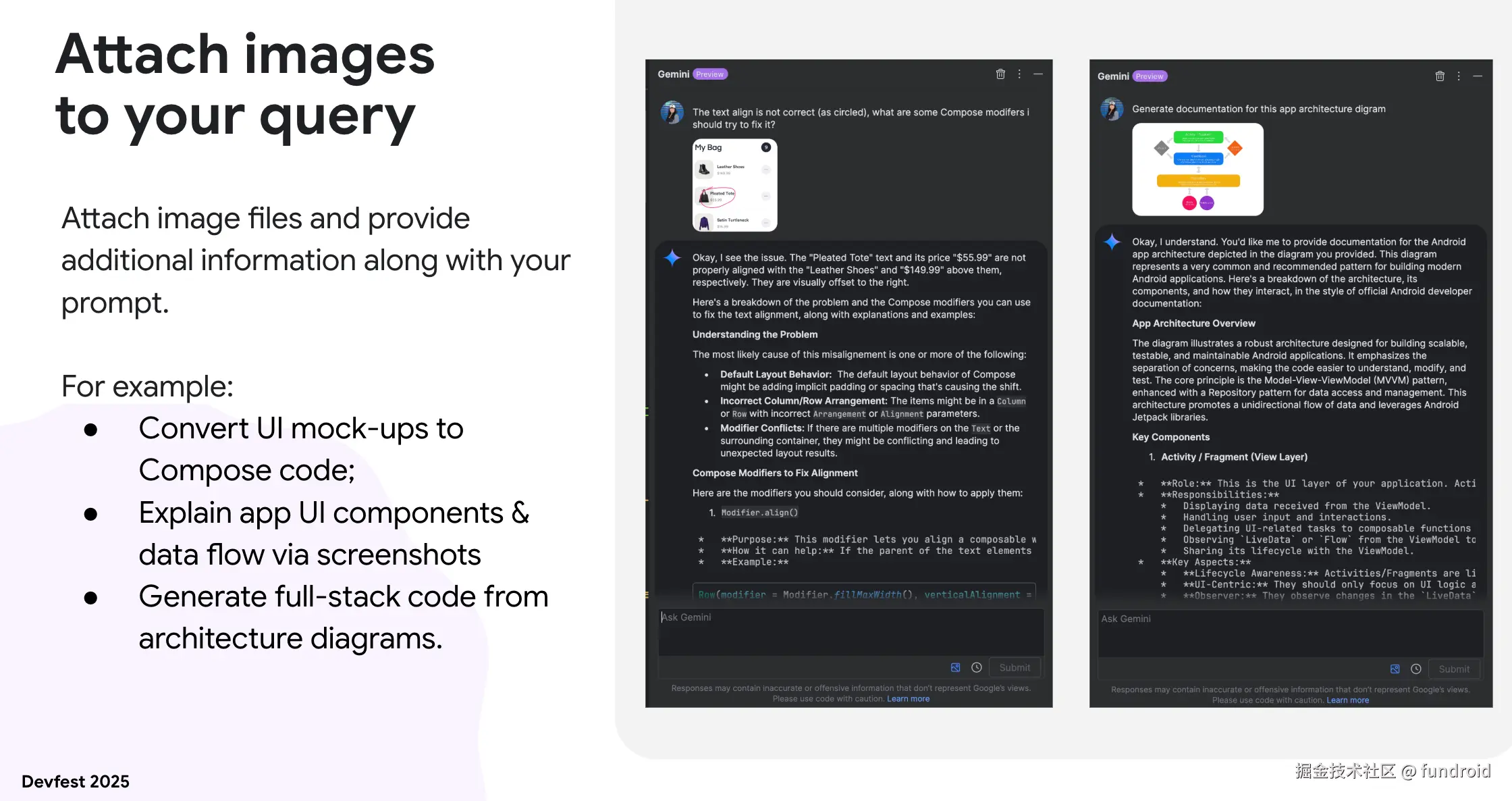 Android Studio 为开发者提供了嵌入式的 AI 对话窗口,成为随时可用的 "开发顾问"。无论是询问 "如何添加相机功能" 这类通用问题,还是将原生 View 代码翻译成 Compose,亦或是通过 "@" 指定项项目文件追提问,都能通过自然语言交互快速得到答案。更强大的是其多模态交互能力 ------ 上传设计稿可直接生成对应代码,上传架构图能自动搭建基础框架,甚至可以上传技术文档截图,让 AI 帮忙解读核心内容,极大降低了技术学习和需求落地的门槛。