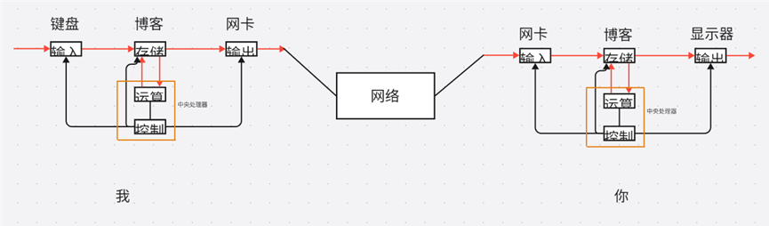现在我在CSDN写了一篇博客,你可以看见我的博客。那么我写的博客在硬件层面上的流动过程是怎样的?假设浏览博客的设备使用的是电脑,那么博客就是在两个冯诺依曼结构之间流动的。