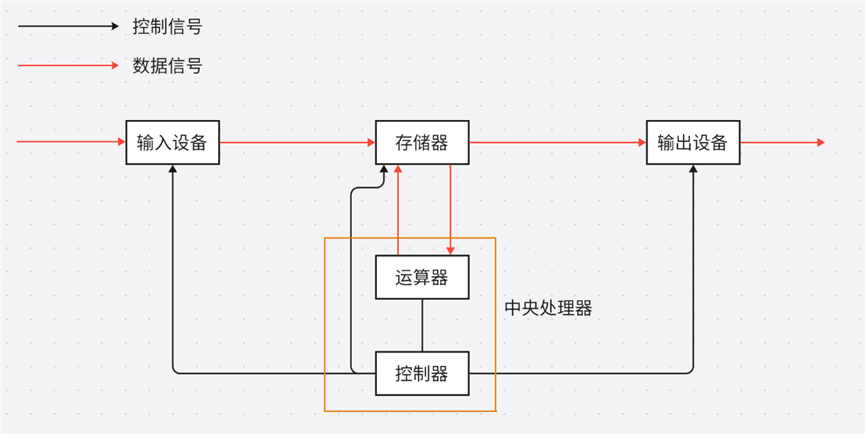 既然速度慢,怎么解决这个问题呢?在设备与 CPU 之间引入新的设备 ------ 存储器。冯诺依曼体系结构规定,从输入设备输入的数据不能直接交给 CPU 处理,而是交给存储器,之后 CPU 需要读取数据只能从存储器获取数据,计算完的结果数据不能直接写入输出设备中,而是写入存储器中,再从存储器刷新到输出设备中。