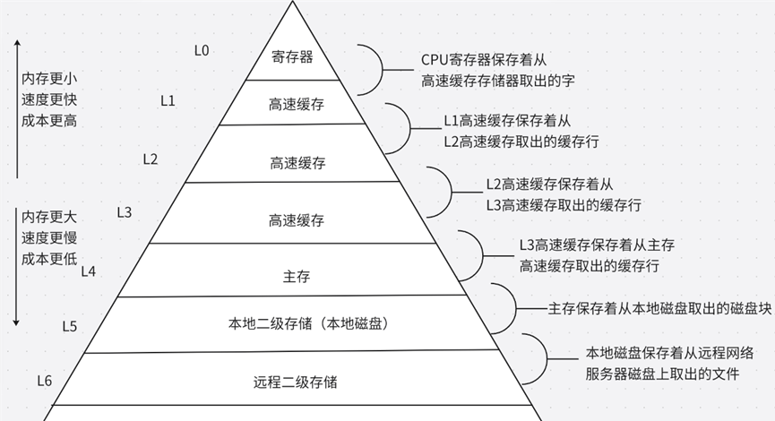 这些具有存储功能的设备,距离CPU设备越近的,存储空间更小,速度更快,成本更高;距离CPU设备越远的,存储空间更大,速度更慢,成本更低。