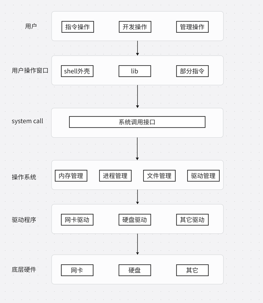 用户使用操作系统的行为:使用操作系统;在操作系统上做开发操作;在操作系统上做管理操作。为了满足用户的使用操作系统的不同场景,操作系统会提供对应的功能。如果要做开发操作,操作系统提供一个库;如果要使用操作系统,操作系统提供一个图像化界面/外壳程序;如果要管理操作系统,如安装/卸载软件,操作系统提供安装/卸载等指令。