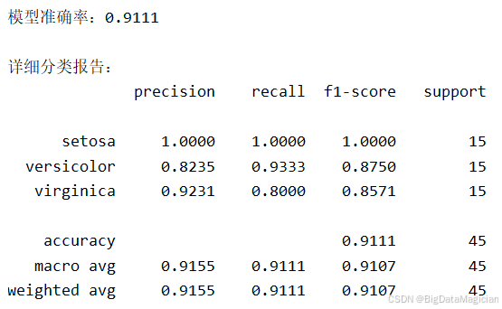 - 花瓣宽度(1.7265):正向权重,花瓣越宽(如1.5-2.5cm),越可能是virginica。