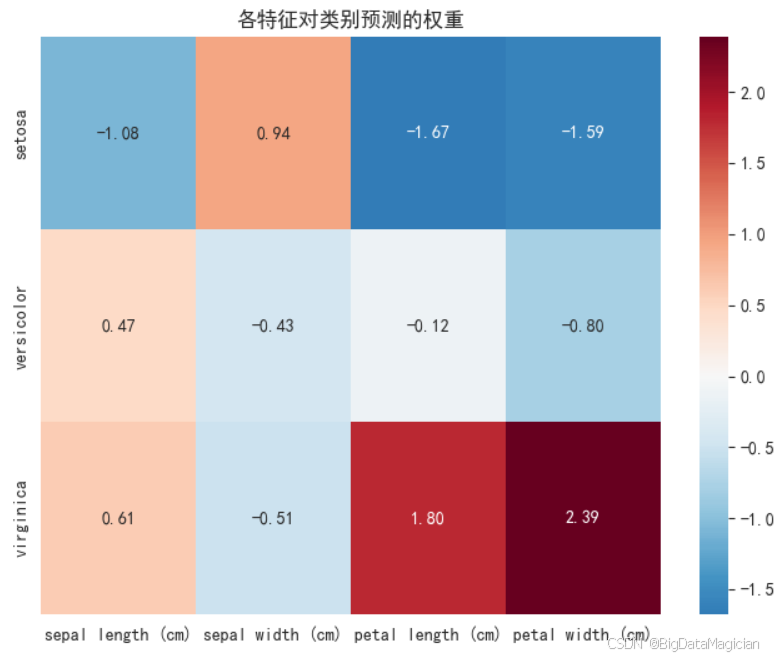 运行结果如下图所示,热力图显示了各特征在三类预测中的权重情况:对于 setosa,petal length 和 petal width 权重为显著负值(-1.67、-1.59),说明其花瓣较短小是识别 setosa 的关键特征;而 sepal width 为正值(0.94),表明宽萼片也有助于识别该类。virginica 类中,petal length 和 petal width 权重极高(1.80、2.39),呈深红色,说明大花瓣是其最显著的判别特征。versicolor 的权重普遍较小,反映其特征与其他两类存在重叠。整体来看,花瓣尺寸是区分三类的核心依据,而萼片特征作用相对次要。