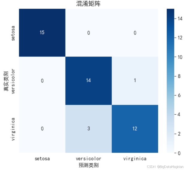 运行结果如下图所示,以热力图形式呈现鸢尾花分类任务的混淆矩阵:行表示真实类别,列表示预测类别,每个格子中的数值表示对应类别的样本数量。颜色深浅反映预测准确度,越深表示数量越多。从图中可以看出,setosa 类完全正确分类(15/15),而 versicolor 和 virginica 之间存在少量混淆,说明模型在区分这两类时仍有一定挑战。