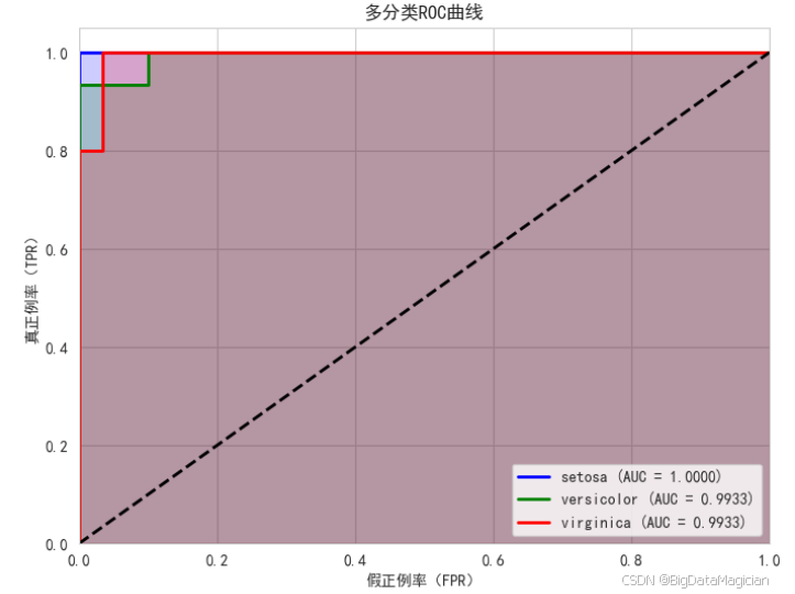 运行结果如下图所示,结果图展示了三个鸢尾花种类的 ROC 曲线:setosa 的 AUC 达到 1.0000,且曲线紧贴左上角,表明模型能完美区分该类别;versicolor 和 virginica 的 AUC 分别为 0.9933,曲线也极度靠近理想位置,说明模型在这两类上的区分能力极强,仅有极少数样本存在混淆。所有曲线均显著高于随机基准线,证明模型具有出色的分类判别能力。填充区域直观地体现了各 AUC 面积大小,进一步验证了模型在多分类任务中的高精度表现。