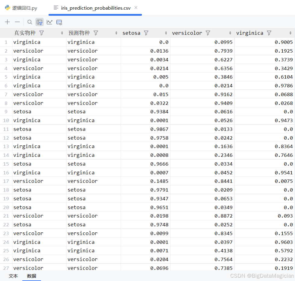 - 截距(-9.6164):基础概率最低,说明模型需要较强的特征信号才会判断样本为virginica。