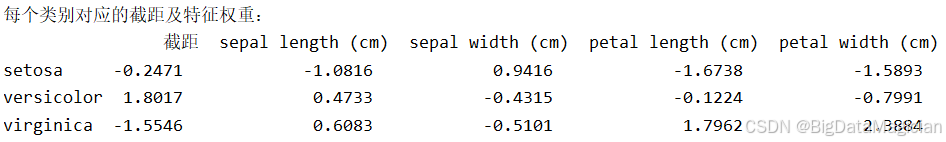| 类别 | 截距 | 花萼长度(cm) | 花萼宽度(cm) | 花瓣长度(cm) | 花瓣宽度(cm) |