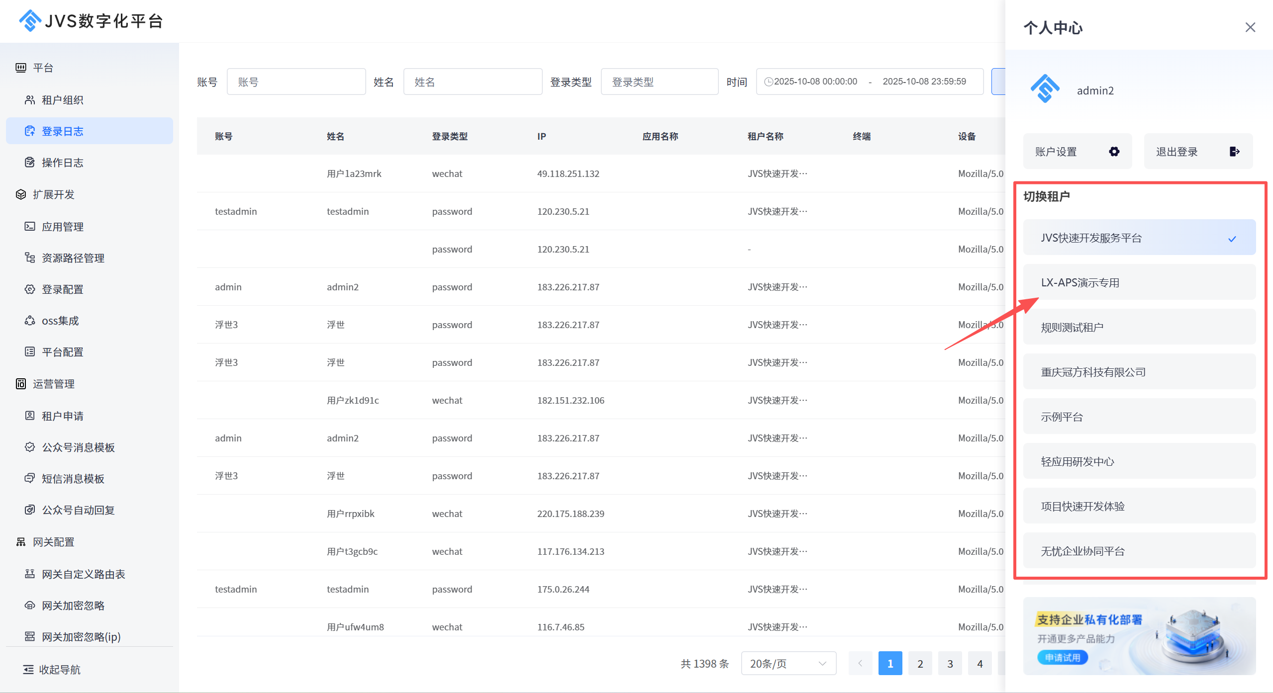 系统会弹出用户中心的操作界面,如下图所示,用户可以点击不同的租户进行切换,以达到切换不同的身份的目的。