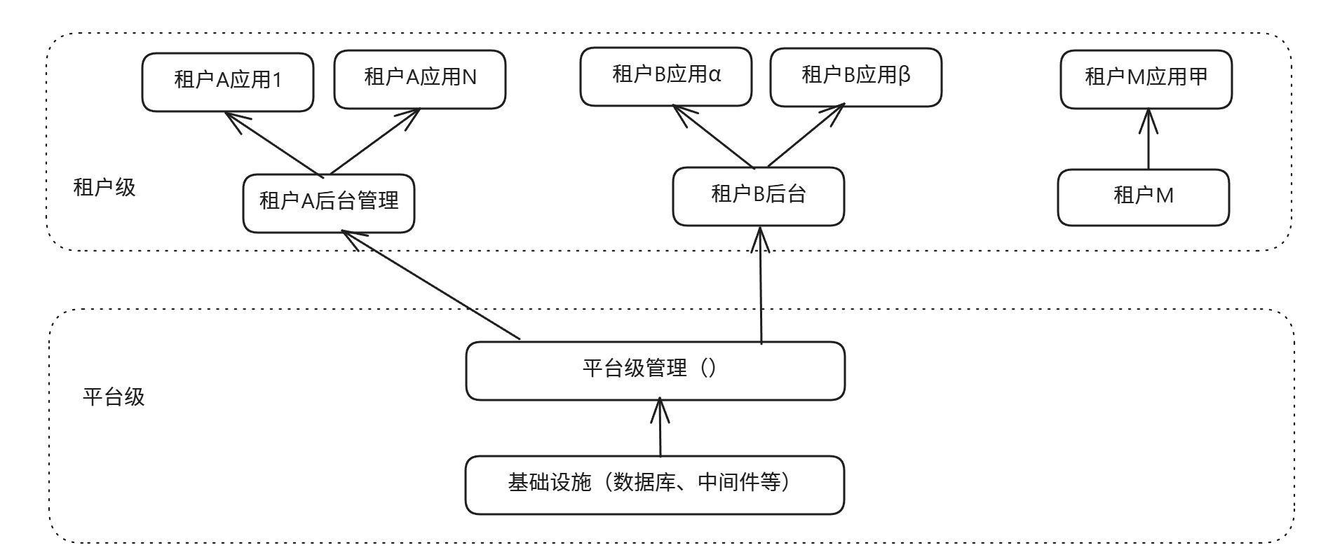 租户(Tenant): 解释"租户"可以是集团下的不同子公司、不同业务部门,或是外部不同的客户企业。每个租户在平台上是一个逻辑上完全隔离的空间。(对应图中的租户A、租户B、租户M),每个租户可以构建自己的应用。