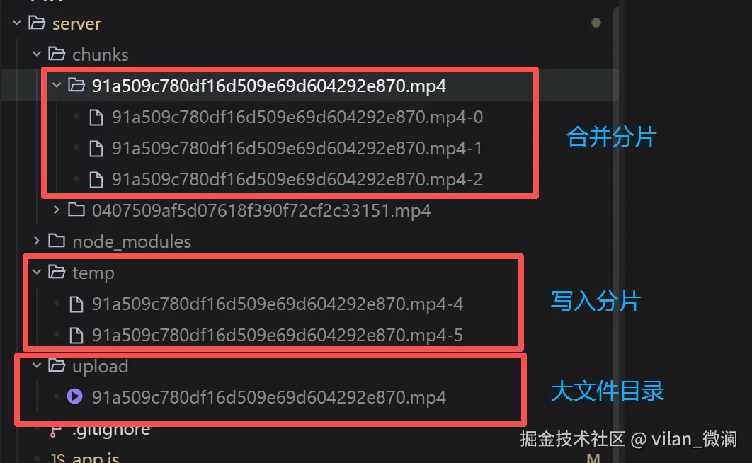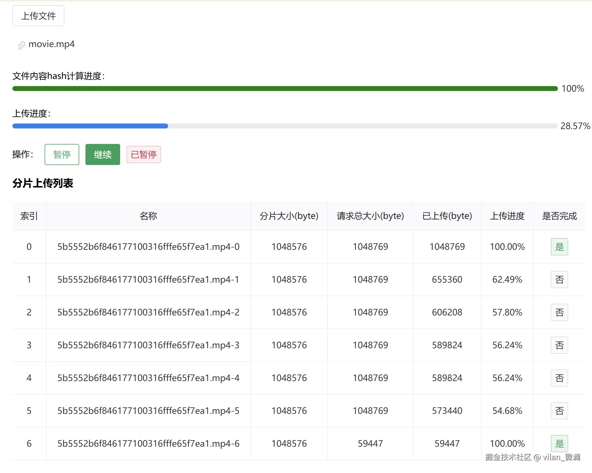 实现分片上传 的核心 是使用文件hash和分片索引 ,对分片名称进行标识 和排序,方便后端查找和排序分片,最后合并分片为一个完整的文件。