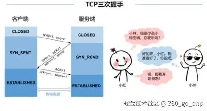 - 建立连接:浏览器与服务器建立 TCP 连接(通过三次握手)。