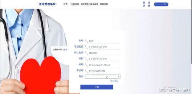不是医疗管理系统中正式用户的是可以在线进行注册的,如果你没有本医疗管理系统的账号的话,添加"注册",当填写上自己的账号+密码+确认密码+昵称+邮箱+手机号等后再点击"注册"按钮后将会先验证输入的有没有空数据,再次验证密码和确认密码是否是一样的,最后验证输入的账户名和数据库表中已经注册的账户名是否重复,只有都验证没问题后即可患者注册成功。其用患者注册界面展示如下图4-3所示。