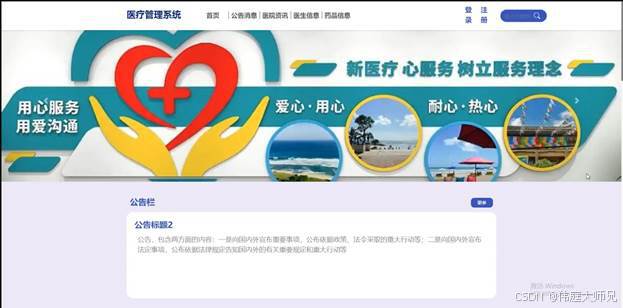当进入医疗管理系统的时候,首先映入眼帘的是系统的导航栏,下面是轮播图以及系统内容,其主界面展示如下图4-1所示。