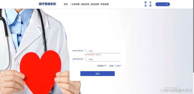 医疗管理系统中的前台上注册后的学生是可以通过自己的账户名和密码进行登录的,当用户输入完整的自己的账户名和密码信息并点击"登录"按钮后,将会首先验证输入的有没有空数据,再次验证输入的账户名+密码和数据库中当前保存的用户信息是否一致,只有在一致后将会登录成功并自动跳转到医疗管理系统的首页中;否则将会提示相应错误信息,患者登录界面如下图4-2所示。