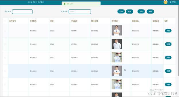 医疗管理系统中的管理人员是可以对前台注册的患者、医生进行管理的,也可以对管理员进行管控。界面如下图4-7所示。