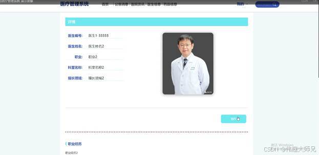当访客点击了任意医生信息后将会进入该医生信息的详情界面,可以了解到该医生信息的医生编号、医生姓名、职业、科室名称、擅长领域等,同时可以对该医生进行预约+评论,医生信息详情展示页面如图4-6所示。