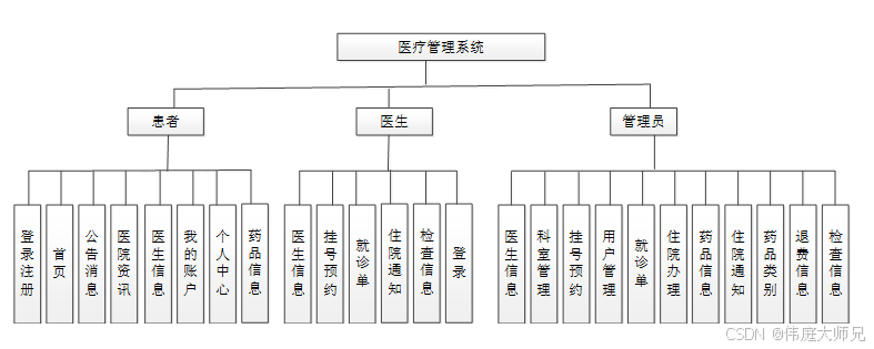 医疗管理系统中的管理人员是可以对医疗管理系统内的管理员发布的医生信息、科室管理、挂号预约、就诊单、住院办理、药品信息、住院通知、药品类别、退费信息、检查信息进行维护和管理的,支持增删改查操作。界面如下图4-10所示。