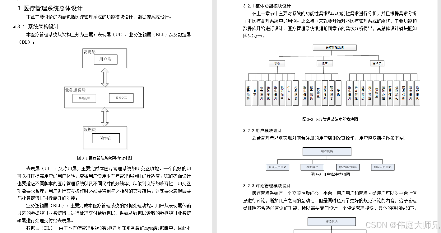 本医疗管理系统从架构上分为三层:表现层(UI)、业务逻辑层(BLL)以及数据层(DL)。