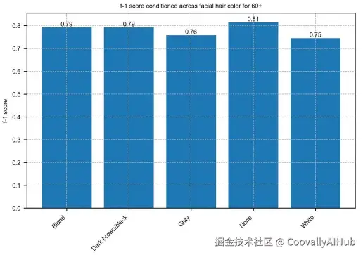 该图显示,对于60岁以上的群体,模型在解析白色胡须时的性能(F-1分数)显著低于其他颜色,表明确实存在与年龄和外表特征相关的偏见。