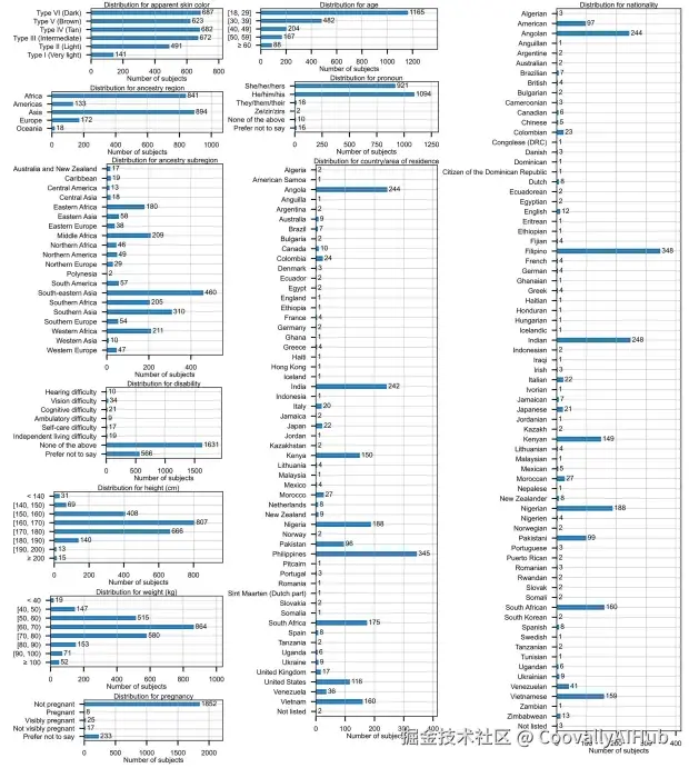 该图展示了FHIBE数据集中被试在肤色、祖源区域、年龄、代词等关键属性上的分布,体现了其在人口统计学上的广泛多样性。