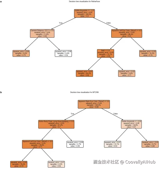 该决策树显示,对于RetinaFace模型,可见关键点数量和相机距离是影响性能的主要因素,而秃顶(无可见头发)与代词存在强关联,揭示了偏见的复杂来源。