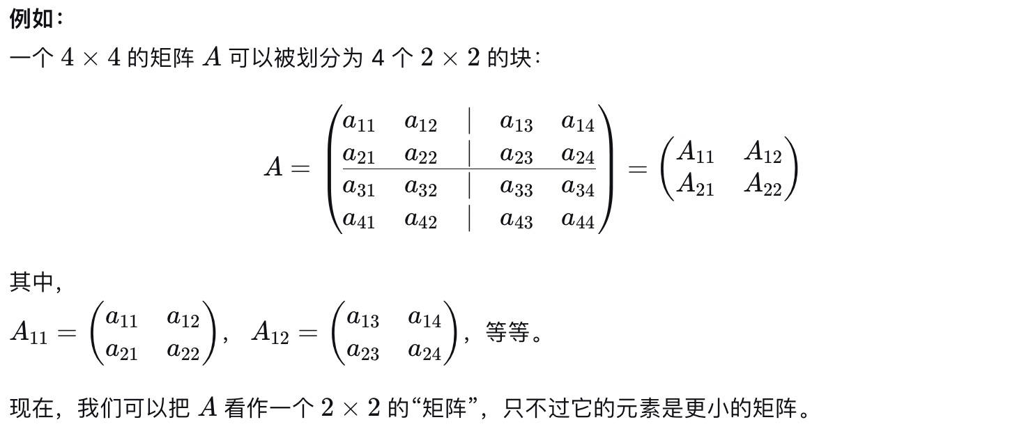 将一个大的矩阵用一些纵线和横线划分成若干个小的块, 这些小块本身也是矩阵; 通过对这些小