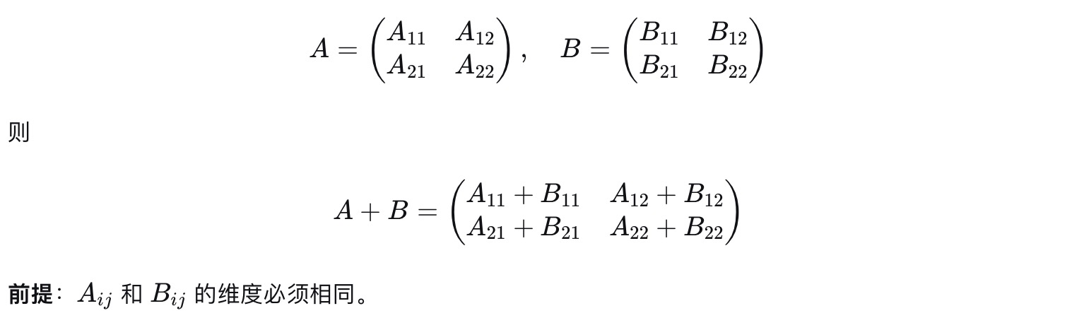 如果两个矩阵A和B被以完全相同的方式分块, 那么它们相加就是对自块相加
